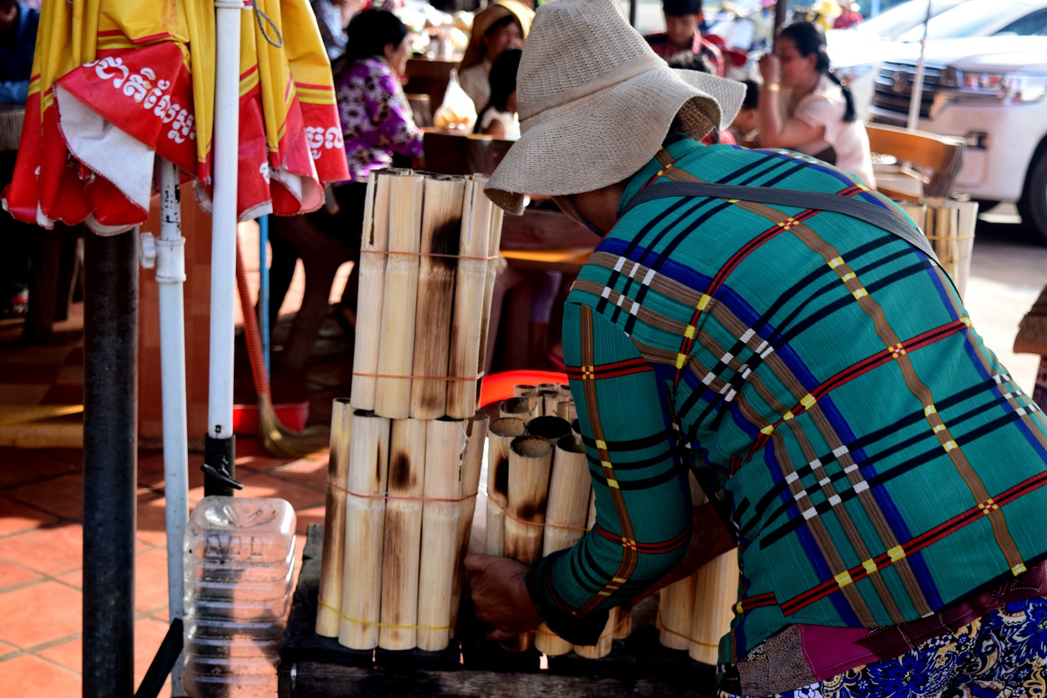 En route from the Cambodian capital of Phnom Penh to the city of Siem Reap – known for the famous Angkor Wat temple complex – you can find local women selling a variety of popular treats and snacks. Probably one of the more famous ones is the sticky rice with black beans, palm sugar and coconut milk. Called ‘kralan’ in the local Cambodian/Khmer language, these are cooked over fire in short bamboo poles, yielding a distinct, salty and sweet flavour. Kralan is often more popular around the Khmer New Year celebrations in April, marking the end of harvest season. Although a part of the diet in the neighbouring countries as well, some say this snack first originated in Cambodian region among the Mon Khmer indigenous peoples of southeast Asia.